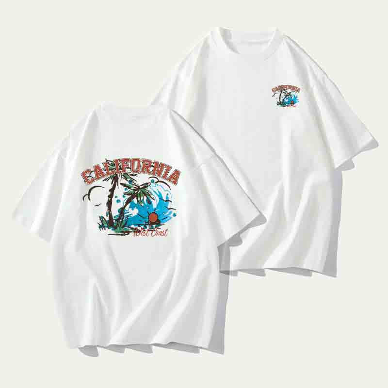 Pattern: Original design. Features a mesmerizing design of crashing waves and swaying palm trees on the back, beautifully showcasing the coastal beauty of the Golden State. With the words 'California West Coast' elegantly printed, it's a perfect way to represent your love for this iconic region.