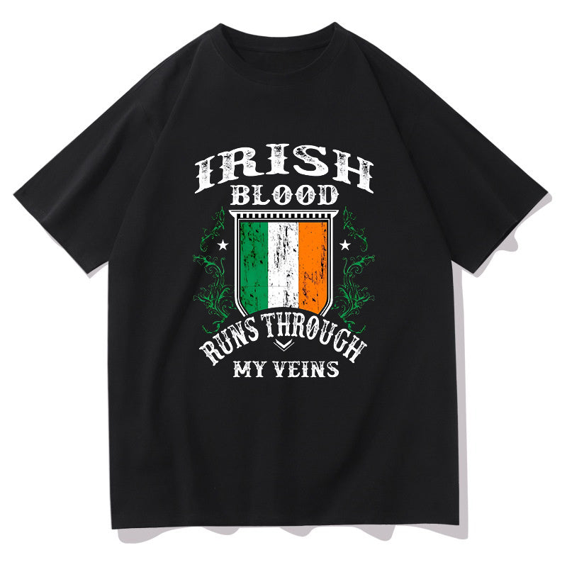Pattern: Showcases the iconic Irish tricolor, symbolizing unity and tradition. This shirt's bold statement, 'IRISH BLOOD RUNS THROUGH MY VEINS,' speaks volumes about your pride.