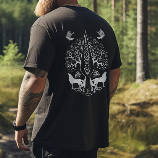 Pattern:This unique T-shirt features a captivating back print inspired by the Tree of Life from Nordic mythology. In Norse culture, the Tree of Life, known as Yggdrasil, symbolizes the interconnectedness of the cosmos and the heart of Viking beliefs. Embrace the essence of Viking heritage with this premium black tee that pays homage to the Tree of Life.