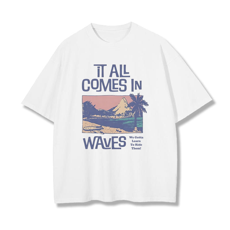 Pattern: Featuring a classic beach scene and the mantra "It All Comes in Waves," is a tribute to surf culture and the philosophy of riding life's highs and lows.