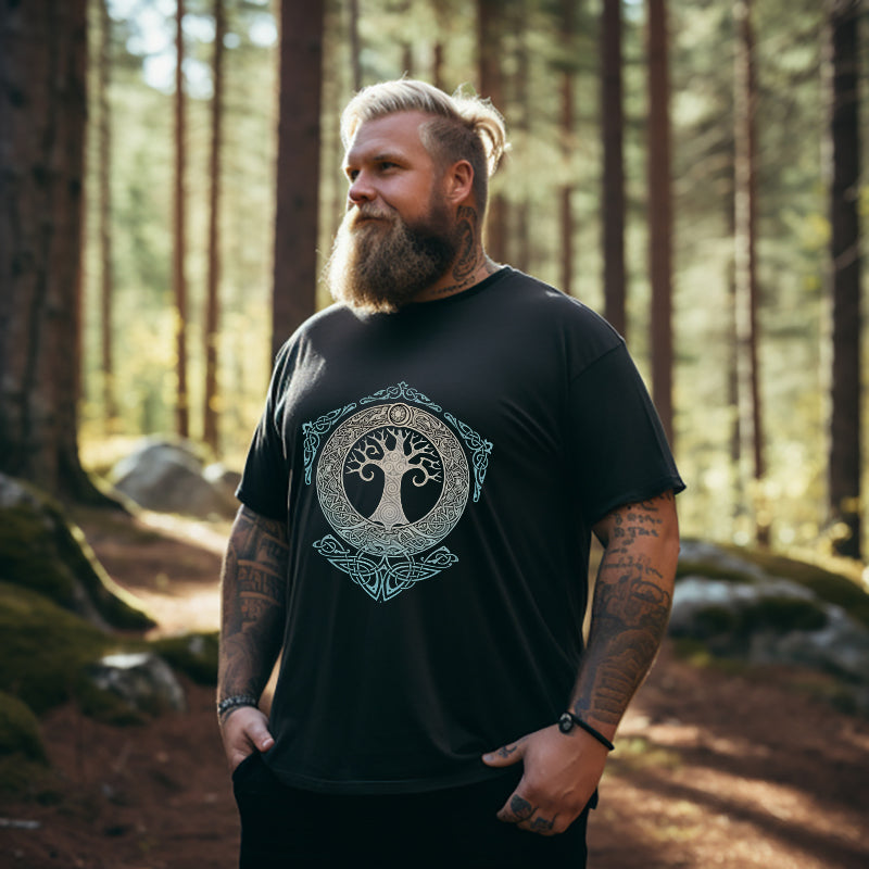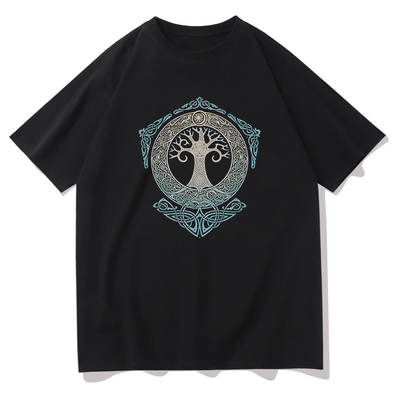 Pattern: Inspired by the Tree of Life from Nordic mythology. In Norse culture, the Tree of Life, known as Yggdrasil, symbolizes the interconnectedness of the cosmos and the heart of Viking beliefs. Embrace the essence of Viking heritage with this premium black tee that pays homage to the Tree of Life.