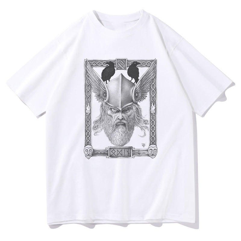 Pattern: The striking print showcases Odin, the powerful Norse god, known for his wisdom, leadership, and connection to ravens. The intricate details capture Odin's fierce yet wise expression, while the raven symbolizes his constant companionship and omniscience.