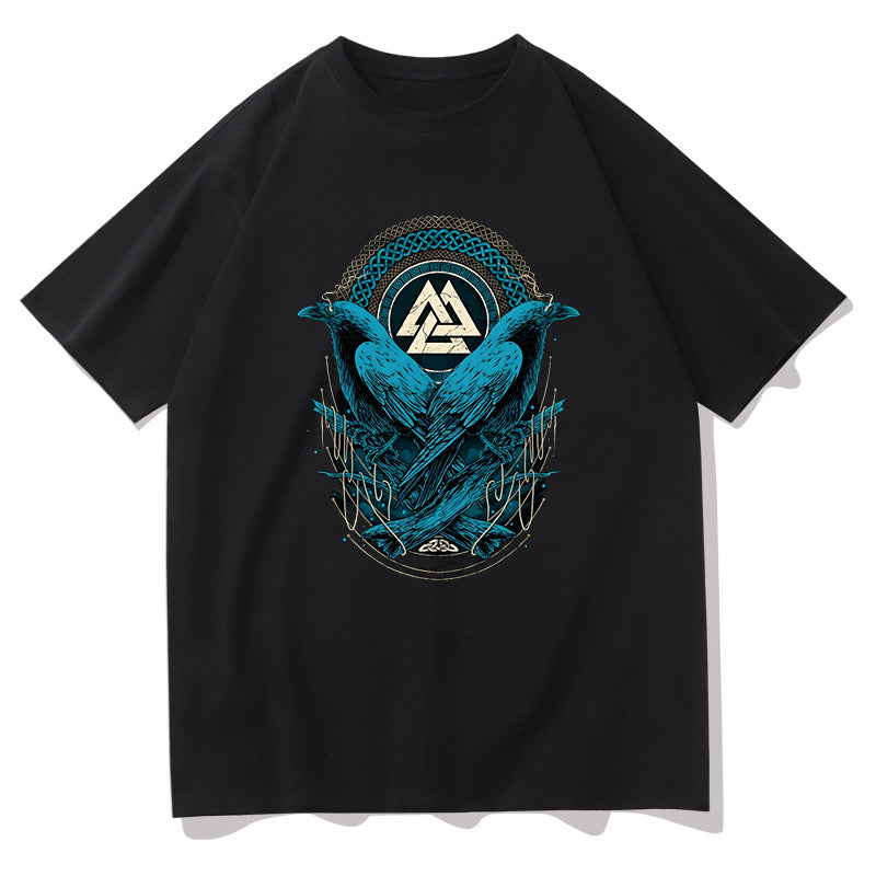 Pattern: Adorned with the iconic Valknut and Odin's Ravens, set against a backdrop of Celtic knotwork, this tee is a tribute to the enduring legacy of Norse mythology.