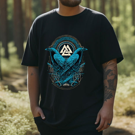 Pattern: Adorned with the iconic Valknut and Odin's Ravens, set against a backdrop of Celtic knotwork, this tee is a tribute to the enduring legacy of Norse mythology.