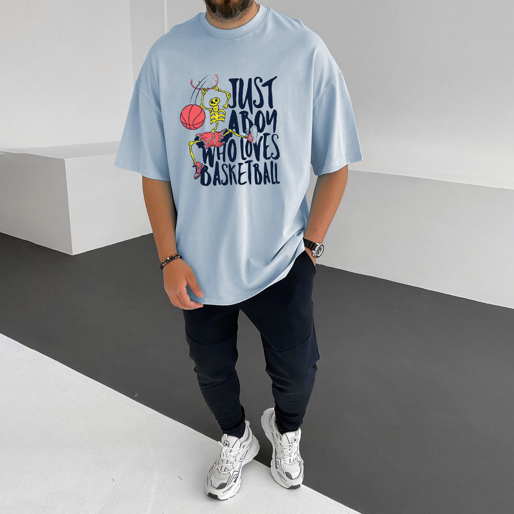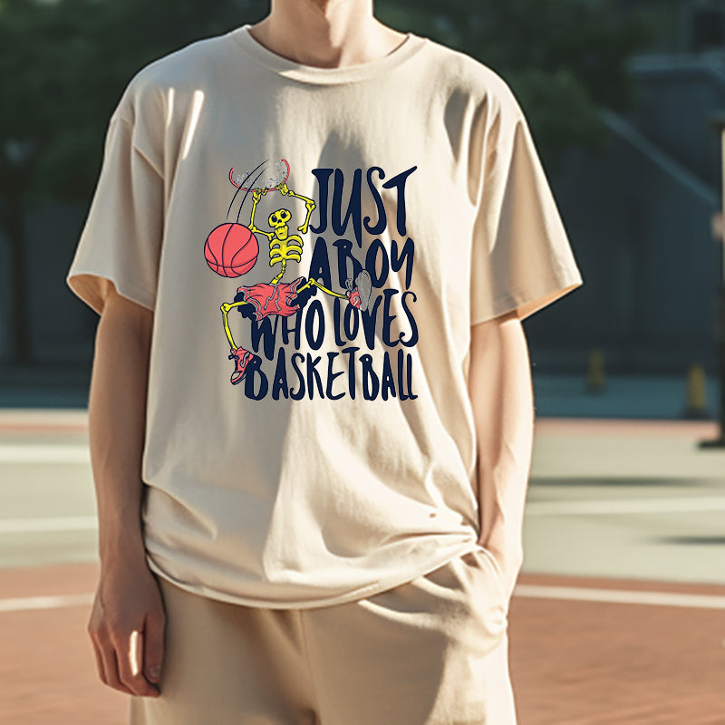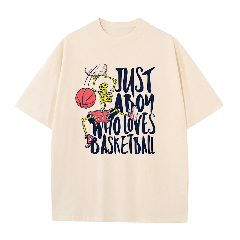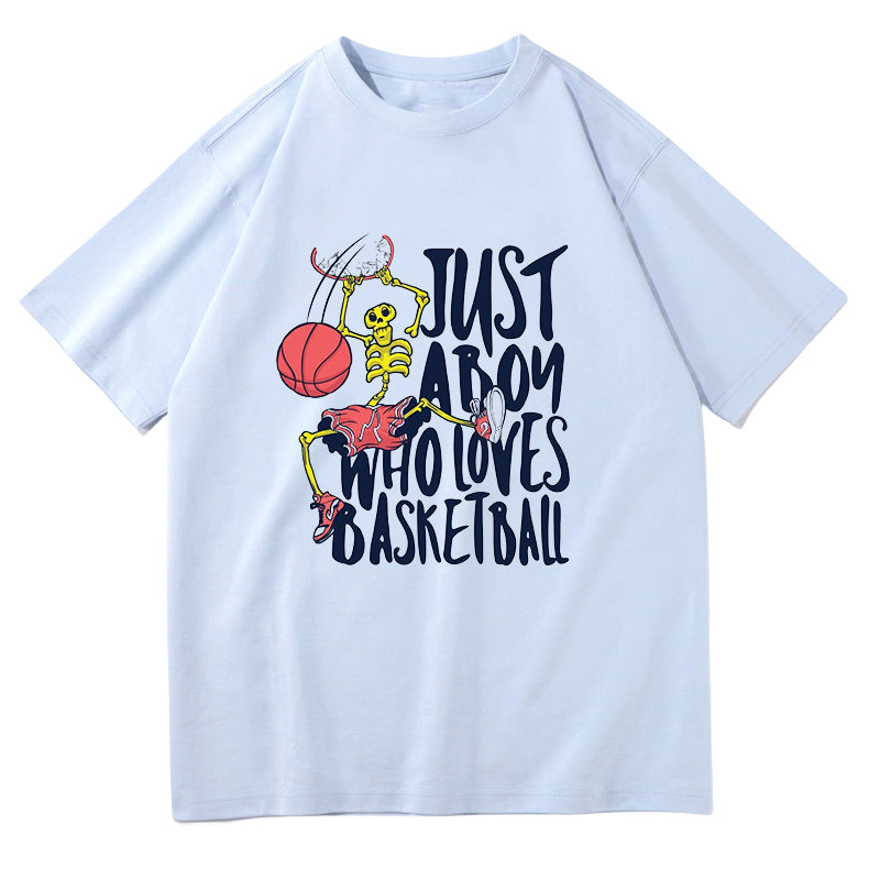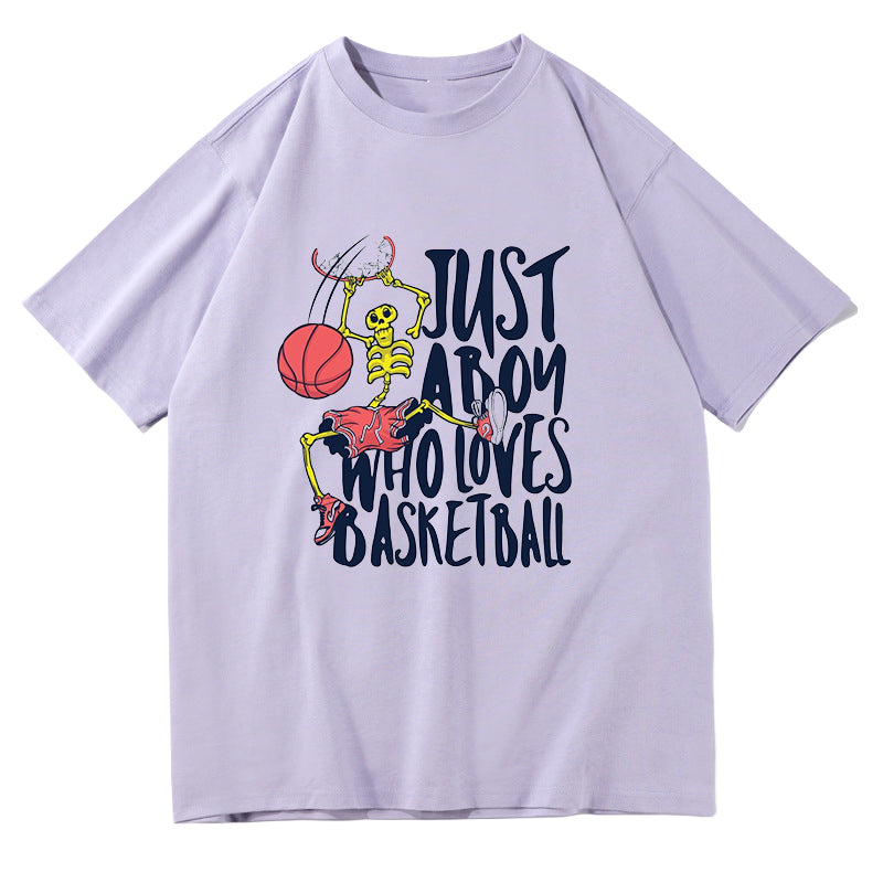 The phrase 'Just A Boy Who Loves Basketball' makes this shirt a perfect gift for any young basketball fan or player. Whether they're hitting the court or cheering from the sidelines, this tee is sure to be a favorite. Made with high-quality material that ensures comfort and durability, it's suitable for everyday wear as well as for sporting activities. Pattern: Features a whimsical skeleton playing basketball, with the text "Just A Boy Who Loves Basketball". Material: Cotton