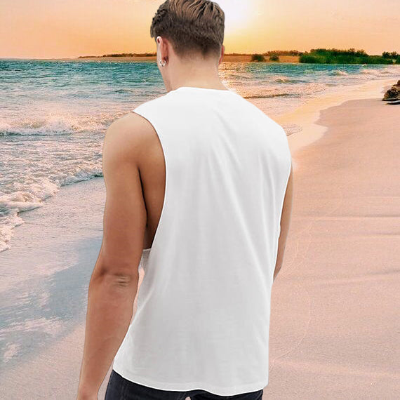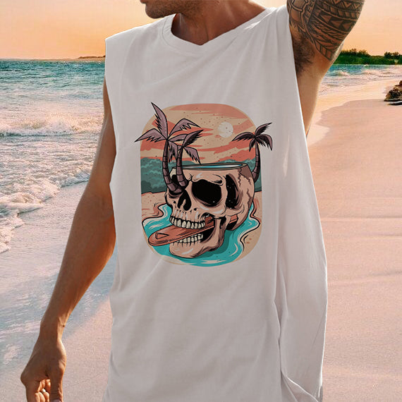 Introducing our men's aussie singlet, designed for a loose and comfortable fit. Made with high-quality materials, this tank top is perfect for those who love the beach and want to showcase their unique style. Featuring a bold print of skulls and beach scenery, it is ideal for beach lovers and exclusive surf enthusiasts alike. Stay cool and stylish in this must-have tank top for any beach adventure or surfing session.
