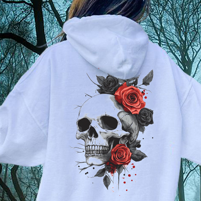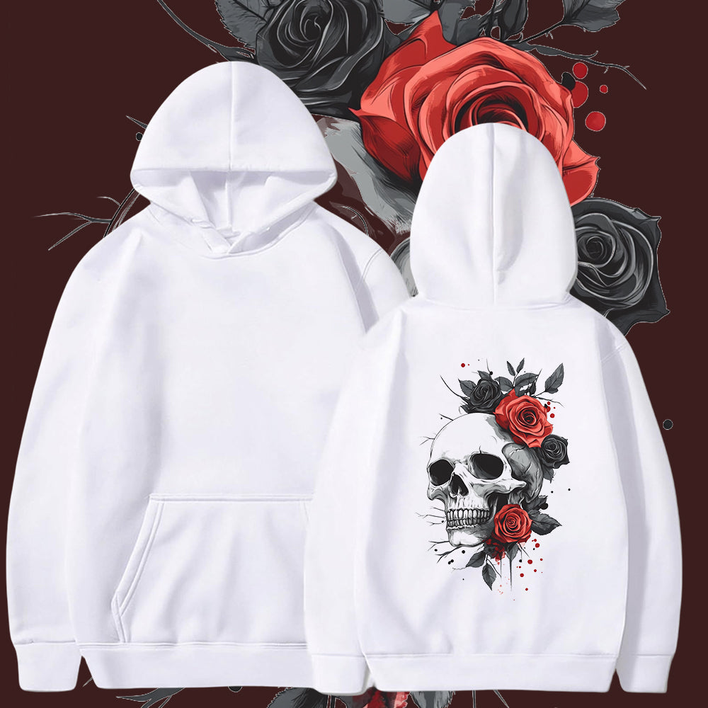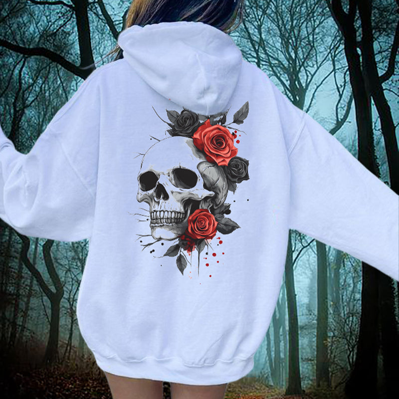 Skull and Red Roses Print Women's Fleeced Hoodie