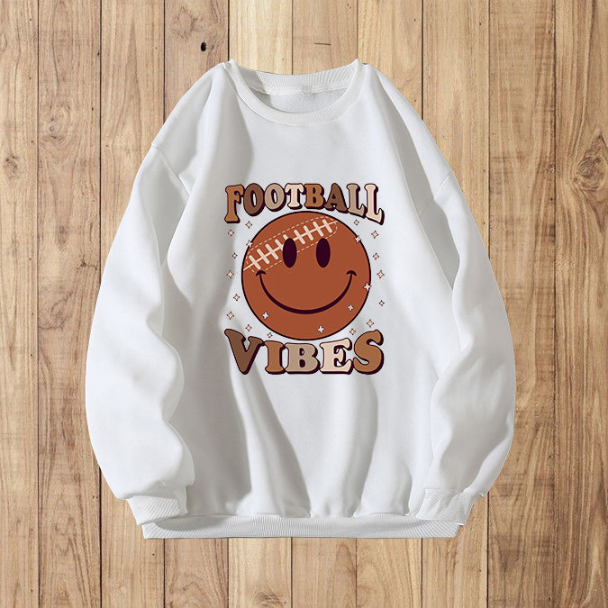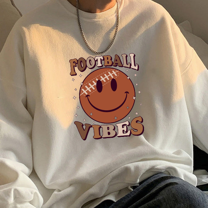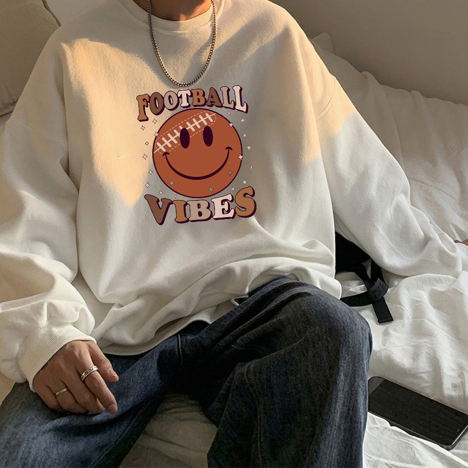 Men's White Crew Neck Sweatshirt designed for American football enthusiasts. This trendy sweatshirt comes in two fabric options: regular and fleece-lined, providing ultimate comfort and warmth. The front of the shirt features a smiley face print with the words "football vibes" in bold letters. Our Men's White Crew Neck Sweatshirt is not only stylish but also durable, making it perfect for everyday wear. Whether you're cheering for your favorite team at the stadium or simply lounging at home, this sweatshirt will keep you cozy and fashionable. Stay ahead of the fashion curve and show off your love for American football with our Men's White Crew Neck Sweatshirt. Grab yours today and join the football vibes!