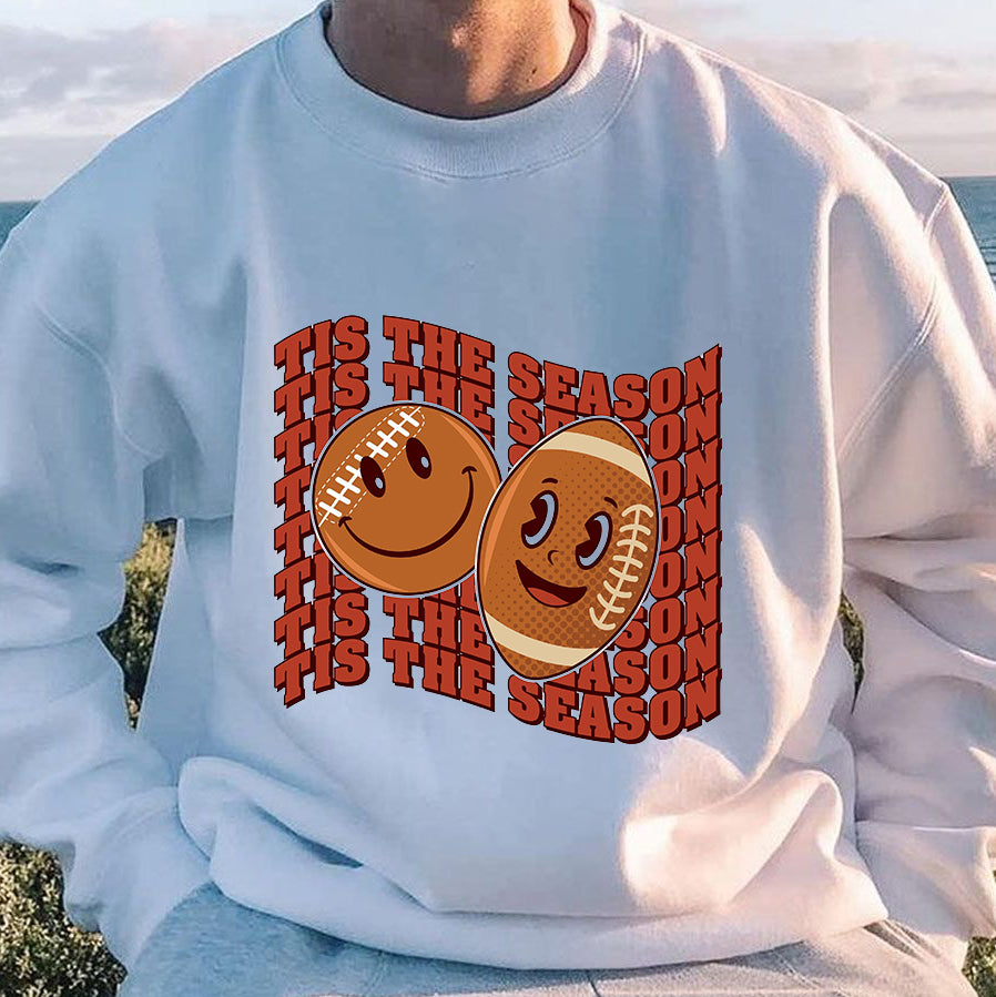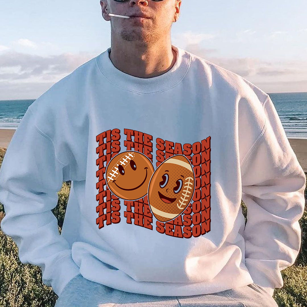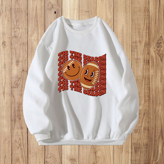 The standout feature of this sweatshirt is its playful print. Adorned with smiley faces and rugby motifs, it adds a touch of youthful exuberance to your outfit. To further enhance the seasonal spirit, we have incorporated the phrase "tis the season" in the design. This makes it the perfect choice for all football or rugby enthusiasts, as it combines their love for the sport with a festive vibe.
