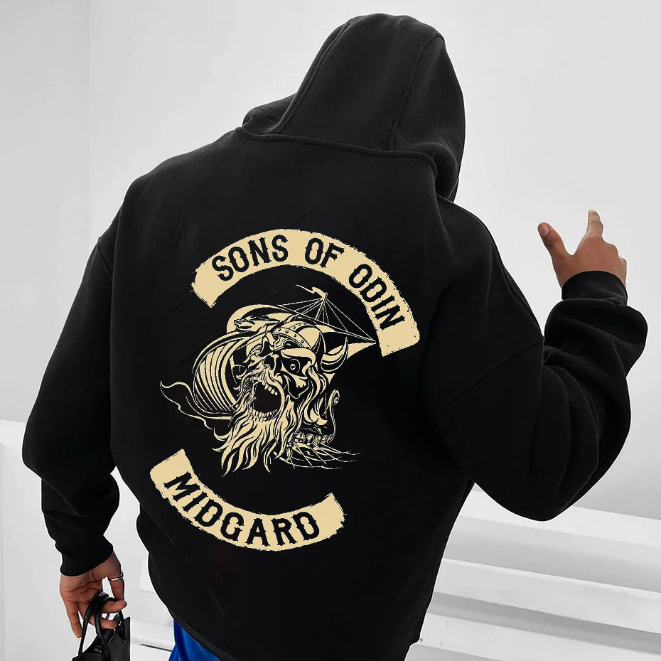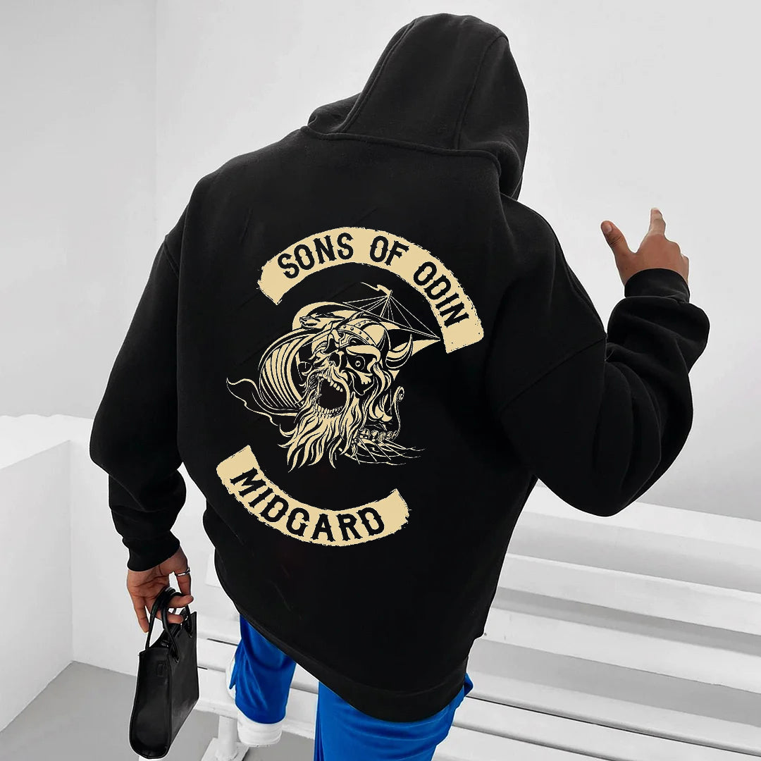 Designed with both style and comfort in mind, this hoodie is a must-have for every man's wardrobe. The fleece lining provides added warmth and coziness, making it perfect for chilly days. Inspired by the powerful Odin, the hoodie features a unique print with the words "Sons of Odin" and "MIDGARD," adding an extra touch of Norse mythology to your look. Stay warm and stylish with our Men's Hooded Sweatshirt.