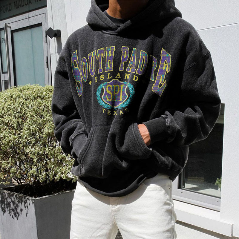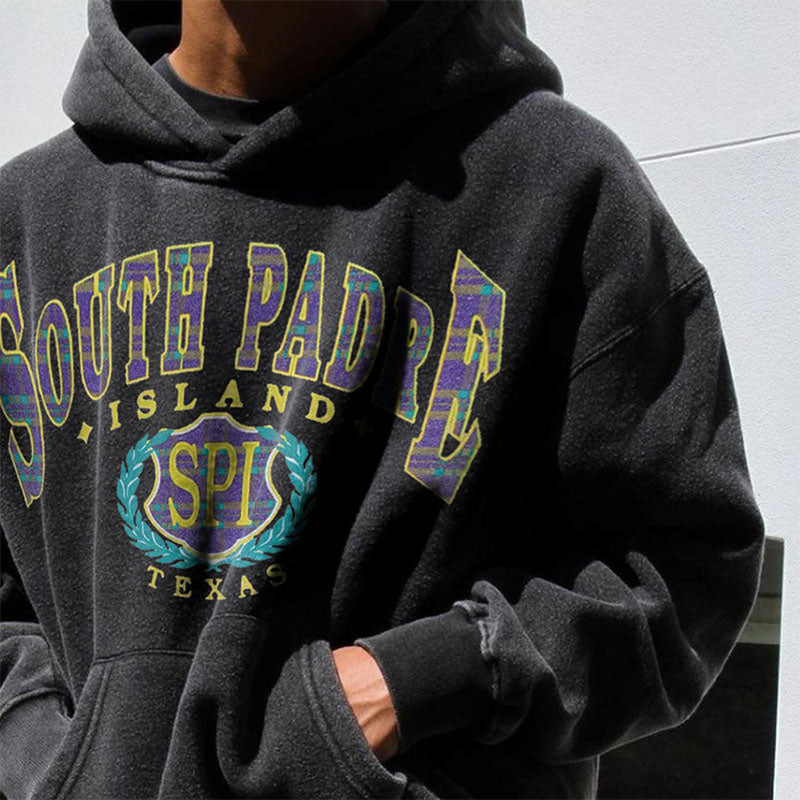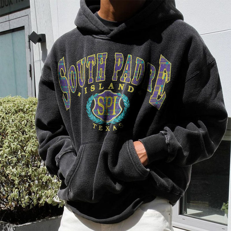 South Pardre Island Graphic Print Men's Fleece Hoodie Black 320g