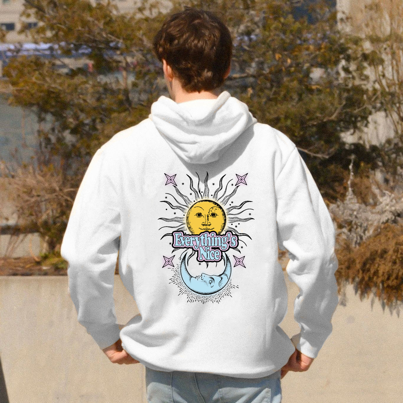 This T-shirt features a print with the phrase "Everything's Nice" and a sun and moon design, conveying a positive and optimistic attitude. It expresses a belief in the beauty of life and encourages people to maintain an optimistic mindset and enjoy every moment. The sun and moon print brings a natural and celestial element, symbolizing light, hope, and balance.