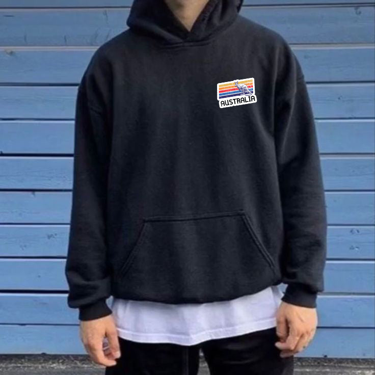 Introducing our Men's Hooded Sweatshirt, featuring a small kangaroo chest print with the word 'Australia'. Made with premium quality materials, this hoodie combines comfort and style effortlessly. Show off your love for Australia with this trendy wardrobe essential. Perfect for casual outings or lounging at home, this hoodie is a must-have addition to your collection. Shop now and embrace the Aussie spirit!"