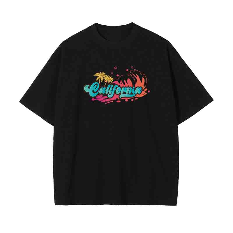 Pattern: Original Design. This stylish tee showcases a captivating design of rolling waves and swaying palm trees, capturing the laid-back coastal vibes of the Golden State. With the word 'California' elegantly printed on the front, it's the perfect way to show your love for this iconic destination.