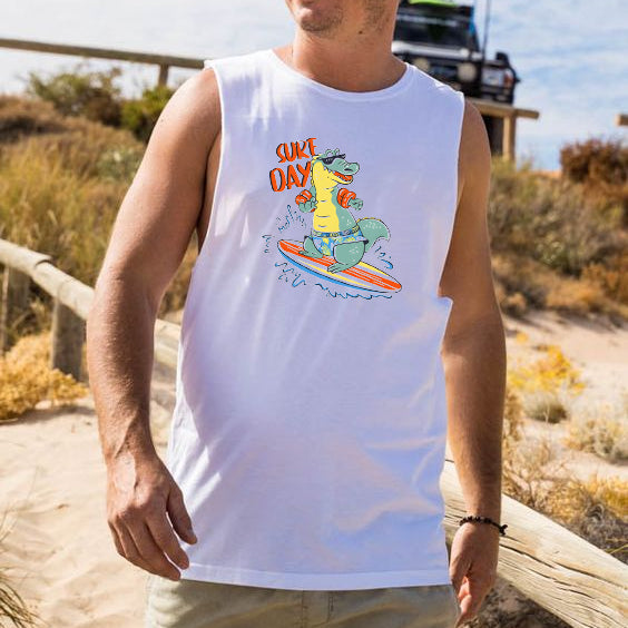 This white men's tank top features a striking crocodile surfing print, showcasing the wild and courageous spirit of surfing. Made with soft and breathable fabric, it keeps you cool and comfortable during hot summer days. The refreshing white background complements the vibrant crocodile surfing pattern, adding style and energy to your outfit. Whether you're enjoying the thrill of surfing at the beach or relaxing in your leisure time, this tank top will be your stylish choice. Wear it proudly to showcase your love for the adventurous spirit of surfing.
