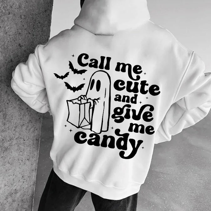 Introducing our men's white hoodie, featuring a delightful twist! This hoodie showcases a charming ghost design on the back, eagerly seeking candy. The printed English lettering adds an extra touch of playfulness, with the phrase "Call me cute and give me candy."Crafted with premium quality materials, this hoodie offers both comfort and style. The white color exudes a clean and versatile look, making it suitable for various occasions. The attached hood provides additional protection against the elements, while also adding a trendy element to the overall design. Ideal for those who appreciate a touch of whimsy, this hoodie is perfect for Halloween parties, casual outings, or simply lounging at home. Its unique ghost motif and catchy slogan are sure to draw attention and spark conversations. Available in various sizes, our men's white hoodie ensures a perfect fit for different body types. Whether you prefer a relaxed or a more fitted style, this hoodie will accentuate your personal fashion sense. Make a statement with our men's white hoodie, complete with an adorable candy-seeking ghost design and the fun message "Call me cute and give me candy." Embrace your playful side and stand out from the crowd with this charming and comfortable hoodie. Order yours today and add a touch of whimsy to your wardrobe!