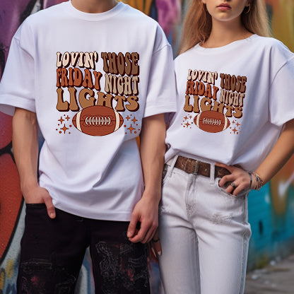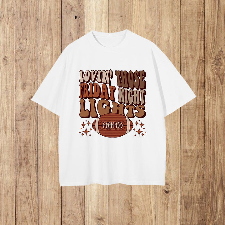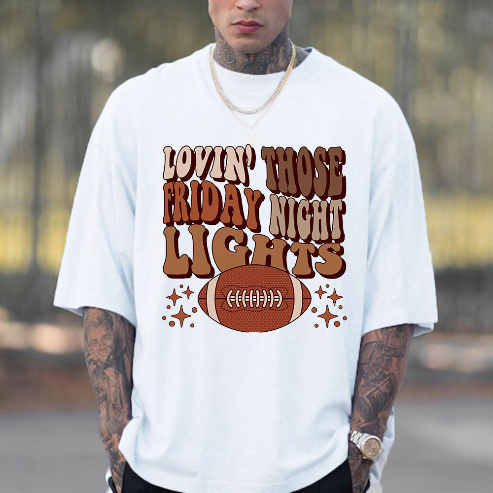Our men's short sleeve cotton t-shirt, crafted from a 230g heavyweight pure cotton fabric. Designed with a loose fit, this shirt offers both comfort and breathability. The front chest features a playful cartoon football print, accompanied by the fun and lively phrase "lovin those Friday night lights" in stylish lettering. Perfect for all football or rugby enthusiasts, this t-shirt combines a comfortable fit with a touch of whimsical charm.