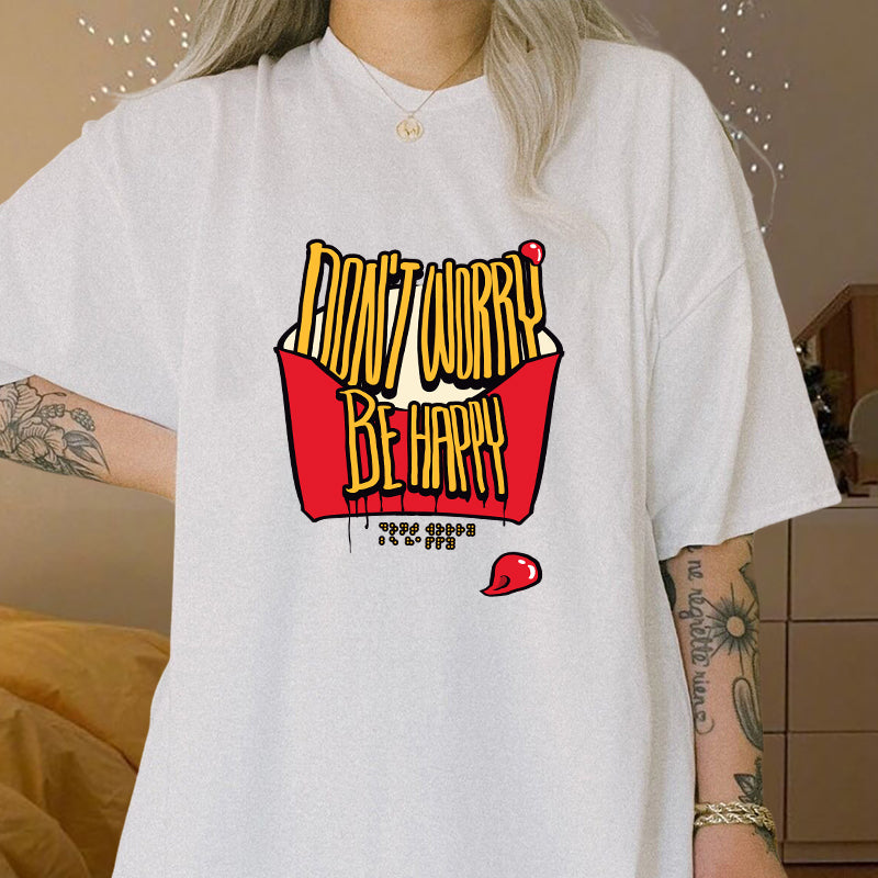 Our Women's Oversize T-shirt, crafted with 100% pure cotton and featuring a comfortable loose fit. Made from high-quality 230g/8.11oz cotton fabric, this T-shirt guarantees a soft and breathable feel. Inspired by the iconic French fries, the print on this tee creatively incorporates the phrase "don't worry, be happy" in English letters. Adding a touch of uniqueness, the bottom of the tee also features Braille design, conveying the same uplifting message of optimism and happiness. Fries of joy, sprinked with positivity. With its relaxed fit and playful design, this T-shirt not only offers comfort but also serves as a reminder to embrace a positive and joyful outlook on life. Wear it proudly and spread the message of positivity wherever you go.
