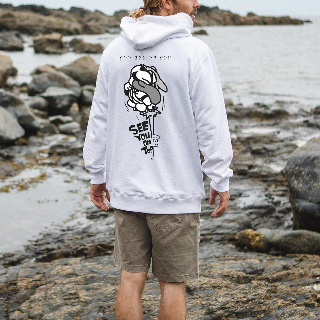 1. Stylish men's white hoodie featuring a drawstring hood and a large front pocket