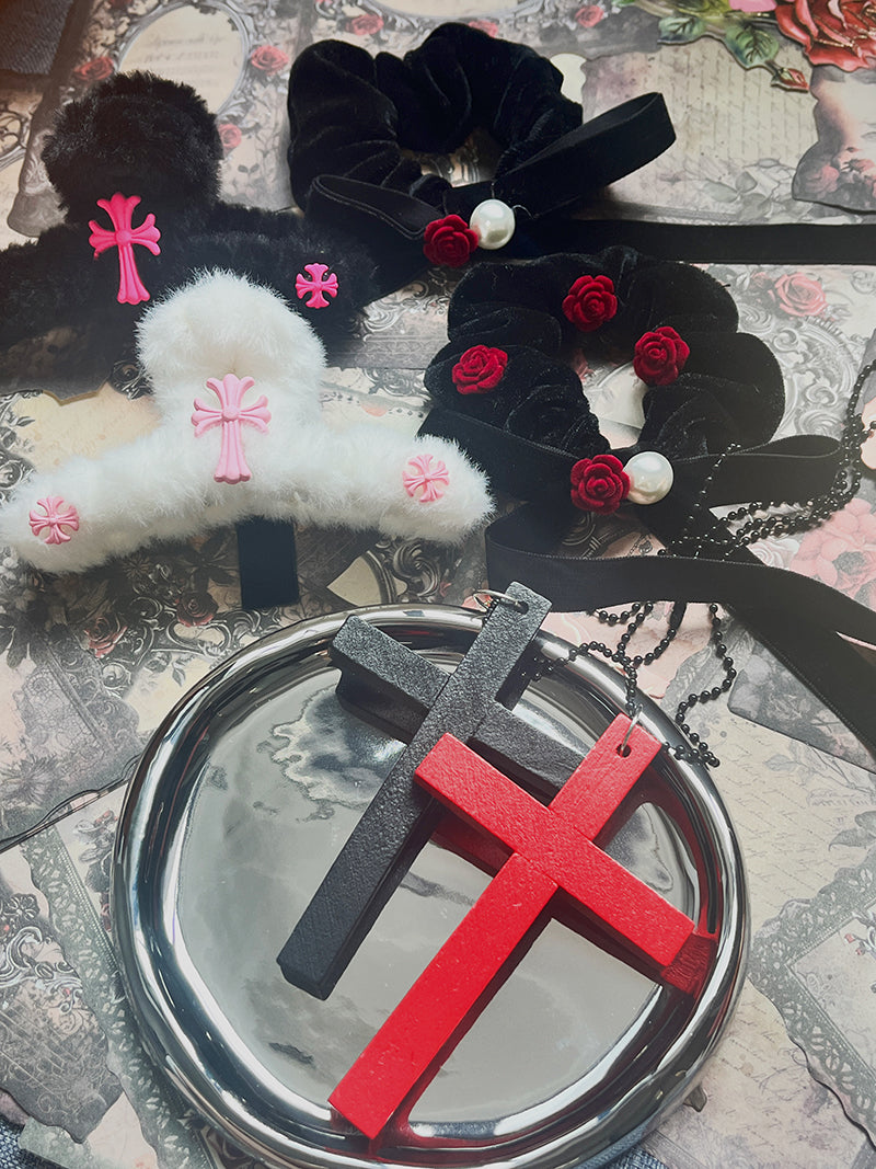 Box 2: Black & White Cross Hair Claws/2 Pearl Rose Hair Ties/1 Red & 1 black Cross Necklace
