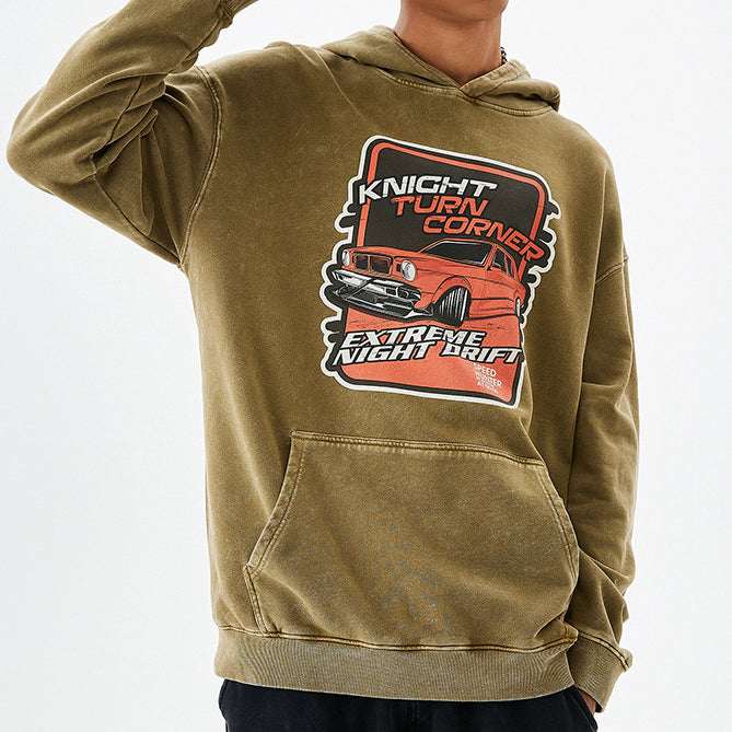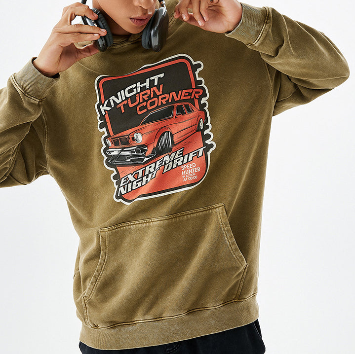 Heavyweight Stonewashed Distressed Hoodie with Car Print