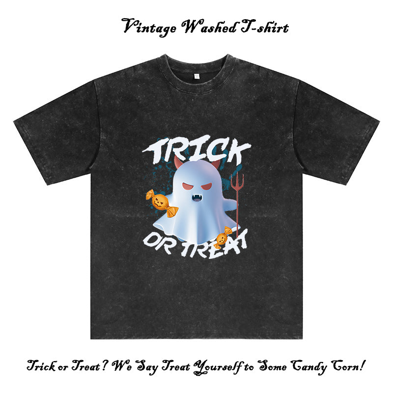 Trick or Treat Ghost Print Men's Washed Black Color Tee
