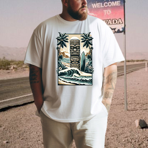 Men' s Tiki statue with surfboard short sleeve tee, a must-have for surf enthusiasts, beach lovers, and anyone looking to infuse their space with a touch of exotic flair.
