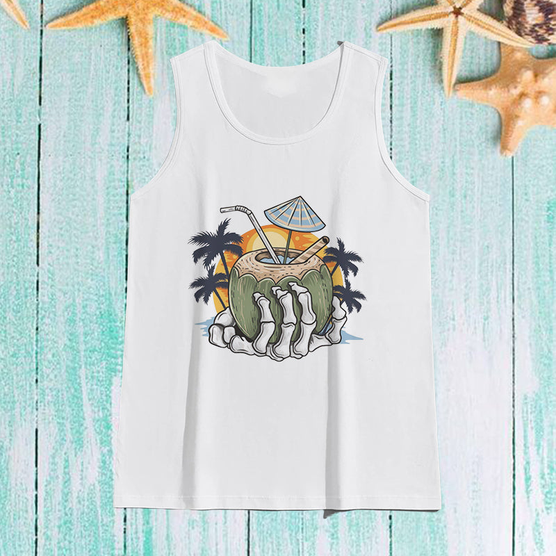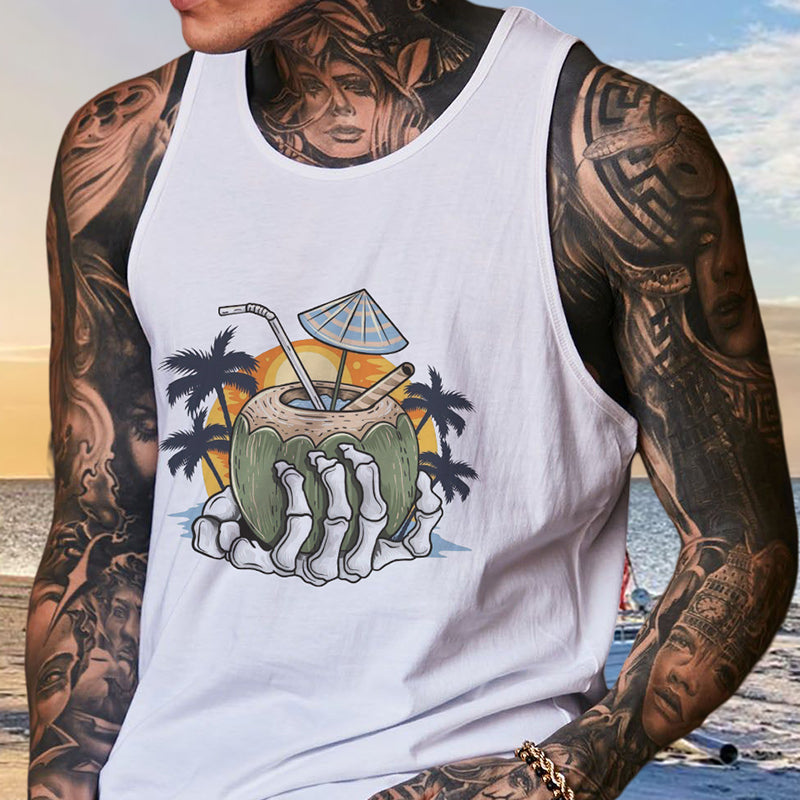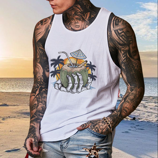 Tropical Vibes Men's Tank Tops with Skull Hand and Coconut Designs