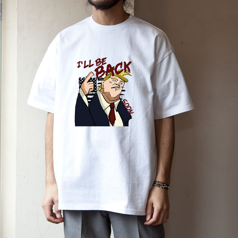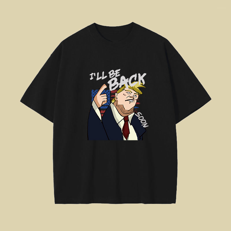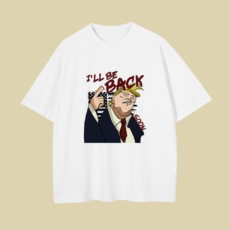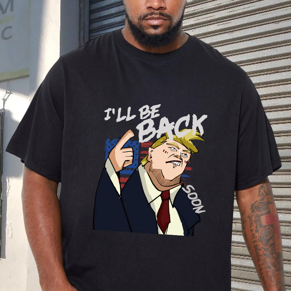 Introducing our latest product - Trump will be back soon cotton tee. Crafted with utmost care, this versatile attire is designed to provide utmost comfort and style. The inspiration for the unique print on this t-shirt comes from the former President Trump - "I will be back soon."